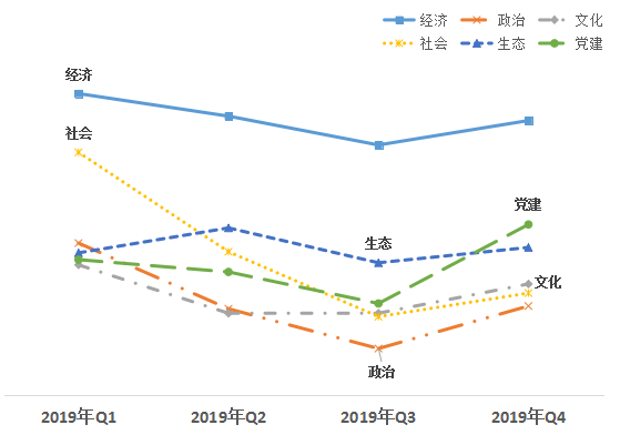 1、從領(lǐng)域來看,文化、政治領(lǐng)域改革熱度值偏低,黨建領(lǐng)域提升最多。第四季度,經(jīng)濟(jì)領(lǐng)域得分78.41,政治領(lǐng)域得分    65.95,文化領(lǐng)域得分67.43,社會領(lǐng)域得分66.82,生態(tài)領(lǐng)域得分69.89,黨建領(lǐng)域得分71.43。