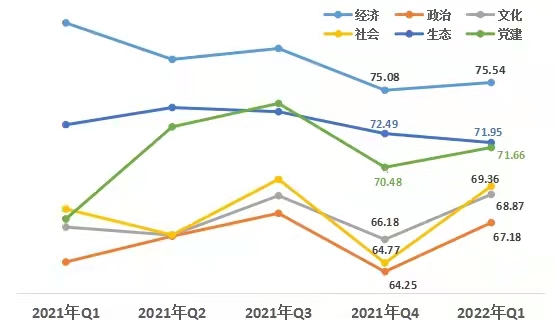 1、從領域來看,經(jīng)濟領域增幅低于其他領域。第一季度,經(jīng)濟領域得分75.54,政治領域得分67.18 ,文化領域得分68.87,社會領域得分69.36,生態(tài)領域得分71.95,黨建領域得分71.66。與上一季度相比,生態(tài)領域小幅下降,其他五個領域均上升。其中社會領域升幅最大,政治領域次之,經(jīng)濟領域提升最小。