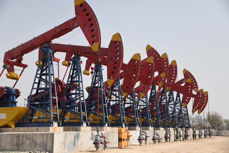 2021年3月31日,勝利油田孤島采油廠的一排抽油機(jī)在作業(yè)。新華社記者 張武岳 攝