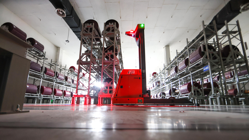 5月17日,AGV(自動導(dǎo)引運(yùn)輸車)穿行在貴州首個5G全連接工廠的部件生產(chǎn)區(qū)內(nèi)。新華社記者 歐東衢 攝