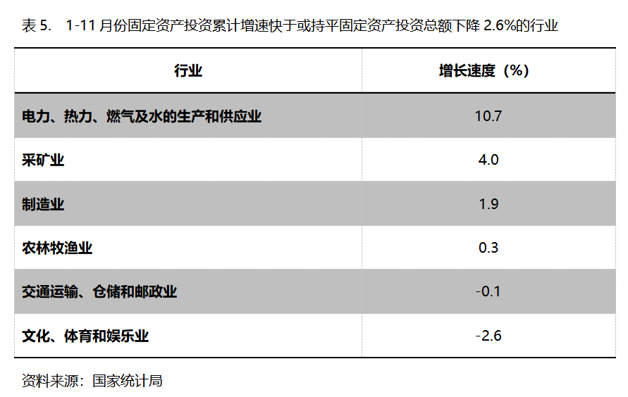 1-11月份,固定資產(chǎn)投資累計增速快于或持平固定資產(chǎn)投資總額下降2.6%的行業(yè)共6個,即電力、熱力、燃?xì)饧八纳a(chǎn)和供應(yīng)業(yè)增長10.7%,采礦業(yè)增長4.0%,制造業(yè)增長1.9%。農(nóng)林牧漁業(yè)增長0.3%,交通運(yùn)輸、倉儲和郵政業(yè)下降0.1%,文化、體育和娛樂業(yè)下降2.6%。