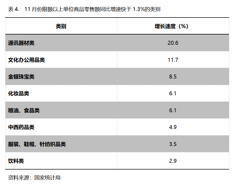 11月份,限額以上單位商品零售額同比增速快于社會消費(fèi)品零售總額1.3%增速的共有8類,即通訊器材類增長20.6%,文化辦公用品類增長11.7%,金銀珠寶類增長8.5%,化妝品類增長6.1%,糧油、食品類增長6.1%,中西藥品類增長4.9%,服裝、鞋帽、針紡織品類增長3.5%,飲料類增長2.9%。