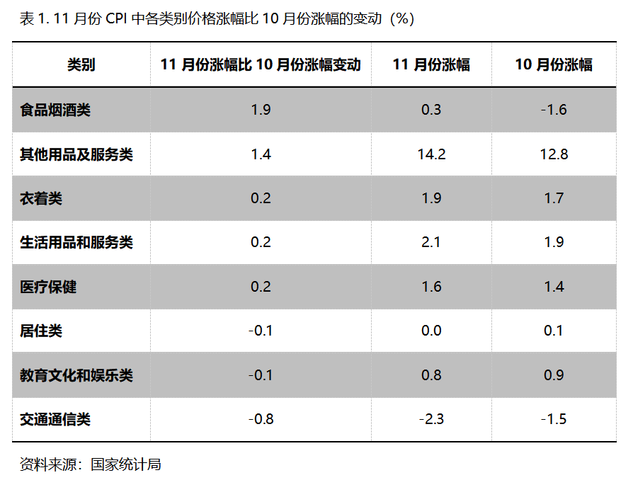 11月份,在CPI 8個類別中有5個類別同比漲幅回升,3個類別回落。漲幅回升的5個類別包括食品類價格由降轉(zhuǎn)漲、漲幅回升1.9個百分點(diǎn),其他用品和服務(wù)類漲幅回升1.4個百分點(diǎn),衣著類、生活用品及服務(wù)類和醫(yī)療保健類漲幅均回升0.2個百分點(diǎn);居住類、教育文化和娛樂類漲幅均回落0.1個百分點(diǎn),交通通訊類降幅擴(kuò)大0.8個百分點(diǎn)。