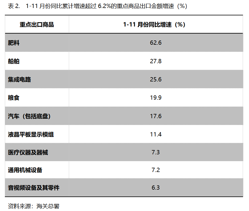 1-11月份,出口金額同比增速超過6.2%的重點(diǎn)商品共有9類,即肥料出口增長62.6%,船舶增長27.8%,集成電路增長25.6%,糧食增長19.9%,汽車(包括底盤)增長17.6%,液晶平板顯示模組增長11.4%,醫(yī)療儀器及器械增長7.3%,通用機(jī)器設(shè)備增長7.2%,音視頻設(shè)備及其零件增長6.3%。