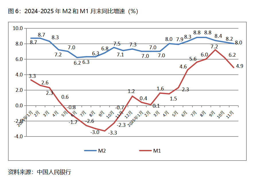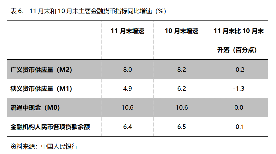 六、M2增速持續(xù)回落。11月末,廣義貨幣供應(yīng)量(M2)同比增長8.0%,比10月末增長8.2%回落0.2個百分點(diǎn),10月末增幅比9月末增長8.4%回落0.2個百分點(diǎn);狹義貨幣供應(yīng)量(M1)同比增長4.9%,比10月末增長6.2%回落1.3個百分點(diǎn),10月末增幅比9月末增長7.2%回落1.0個百分點(diǎn);流通中貨幣(M0)同比增長10.6%,與10月末增長10.6%持平,10月末增幅比9月末增長11.5%回落0.9個百分點(diǎn)。11月份末,M2增速已連續(xù)3個月回落,M1增速已連續(xù)2個月回落,M0由回落轉(zhuǎn)為持平。