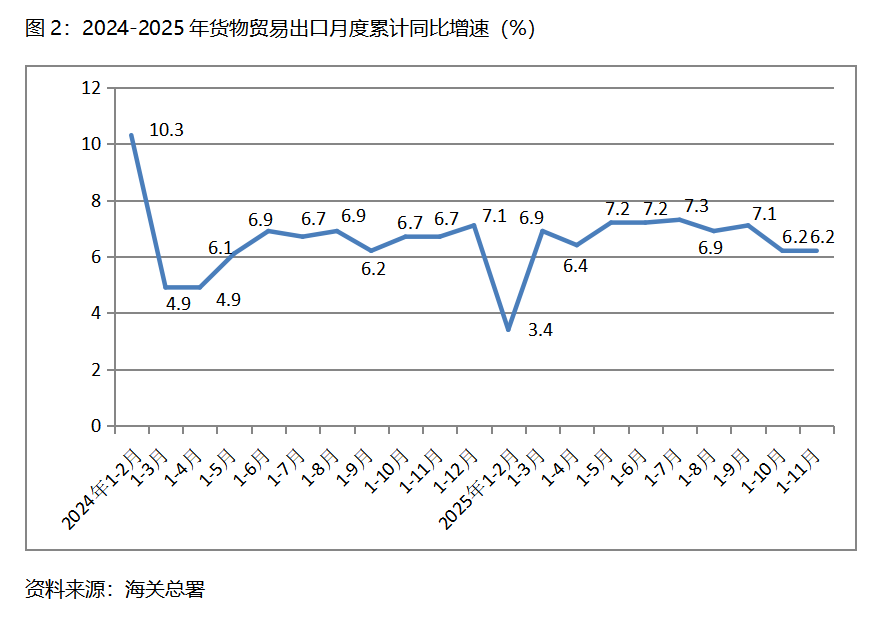 二、出口增速由落轉(zhuǎn)平。1-11月份,貨物出口同比增長6.2%,與1-10月份增長6.2%持平,1-10月份比1-9月份增長7.1%回落0.9個百分點(diǎn)。貨物出口對主要貿(mào)易出口經(jīng)濟(jì)體增速有升有落有平,1-11月份對歐盟出口同比增長8.9%,比1-10月份對歐盟出口同比增長8.4%回升0.5個百分點(diǎn);對美國出口下降18.3%,比1-10月份下降17.1%擴(kuò)大1.2個百分點(diǎn);對東盟出口增長14.6%,比1-10月份增長15.3%回落0.7個百分點(diǎn);對拉丁美洲出口增長7.9%,比1-10月份增長7.3%回升0.6個百分點(diǎn);對非洲出口增長27.2%,與1-10月份增長27.2%持平。貨物出口在跌宕起伏的國際形勢下仍保持穩(wěn)定增長,彰顯出我國對外貿(mào)易的較強(qiáng)韌性。