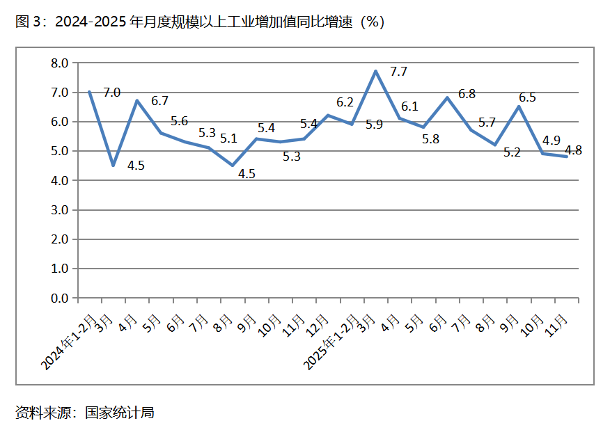 三、工業(yè)增速持續(xù)回落。11月份,規(guī)模以上工業(yè)增加值同比增長4.8%,比10月份增長4.9%回落了0.1個百分點(diǎn),10月份比9月份增長6.5%回落了1.6個百分點(diǎn)。從工業(yè)三大門類看,采礦業(yè)增速比上月回升,制造業(yè)和電力、熱力、燃?xì)饧八a(chǎn)和供應(yīng)業(yè)增速回落,11月份,采礦業(yè)同比增長6.3%,比上月增長4.5%回升1.8個百分點(diǎn);制造業(yè)增長4.6%,比上月增長4.9%回落0.3個百分點(diǎn);電力、熱力、燃?xì)饧八a(chǎn)和供應(yīng)業(yè)增長4.3%,比上月增長5.4回落1.1個百分點(diǎn)。