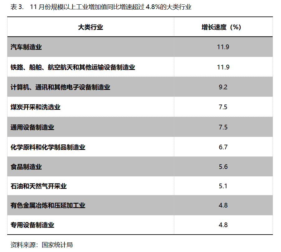 11月份,增長速度超過或持平規(guī)模以上工業(yè)增長4.8%的主要大類行業(yè)共有10個,即汽車制造業(yè)同比增長11.9%,鐵路、船舶、航空航天和其他運(yùn)輸設(shè)備制造業(yè)增長11.9%,計算機(jī)、通訊和其他電子設(shè)備制造業(yè)增長9.2%,煤炭開采和洗選業(yè)增長7.5%,通用設(shè)備制造業(yè)增長7.5%,化學(xué)原料和化學(xué)制品制造業(yè)增長6.7%,食品制造業(yè)增長5.6%,石油和天然氣開采業(yè)增長5.1%,有色金屬冶煉和壓延加工業(yè)增長4.8%,專用設(shè)備制造業(yè)增長4.8%。