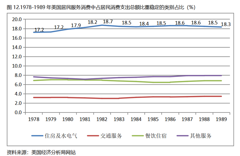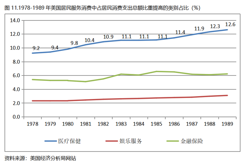 由于數(shù)據(jù)來源的原因,重點(diǎn)將看一下美國居民服務(wù)消費(fèi)類別在人均GDP超過1萬美元后的變化情況。美國居民服務(wù)消費(fèi)共有7個大類別,在1978-1989年期間占居民消費(fèi)支出總額比重提高的有3個類別,分別是醫(yī)療保健、娛樂服務(wù)和金融保險(xiǎn),醫(yī)療保健占居民消費(fèi)支出總額的比重提高了3.4個百分點(diǎn),娛樂服務(wù)和金融保險(xiǎn)占居民消費(fèi)支出總額的比重均提高了0.8個百分點(diǎn)。