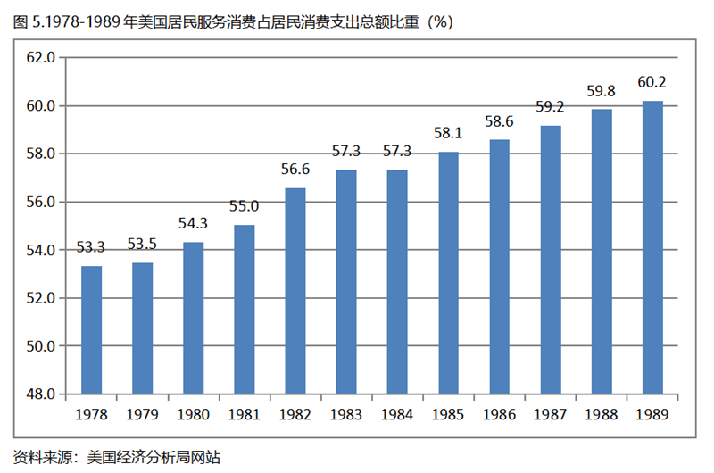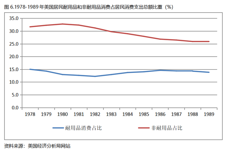 美國在人均GDP超過1萬美元后的1978-1989年期間,居民服務(wù)消費(fèi)占居民消費(fèi)支出總額持續(xù)提高,而居民耐用品消費(fèi)占居民消費(fèi)支出總額比重、非耐用品消費(fèi)占居民消費(fèi)支出總額比重均呈現(xiàn)下降趨勢。